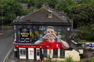 这幅画描绘了若塔庆祝进球的瞬间。壁画位于距离红军主场不远处的半路屋酒吧外墙上,这里离若塔自2020年9月从狼队加盟后享受过无数欢乐时光的地方仅几步之遥。